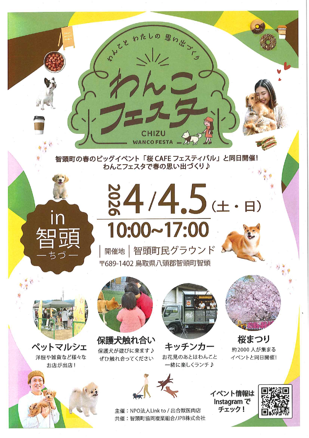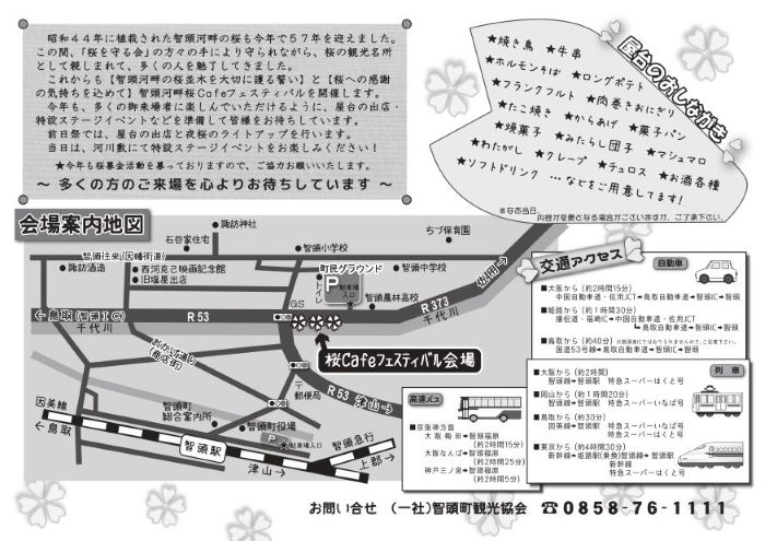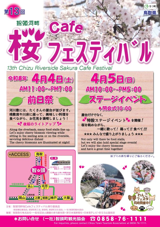 主催:第13回智頭河畔桜Cafeフェスティバル実行委員会 (智頭建設業協会・智頭町商工会・智頭町・智頭町文化協会・(一社)智頭町観光協会 後援:智頭急行株式会社、麒麟のまち観光局、新日本海新聞社、日本海テレビ、BSS山陰放送 |
